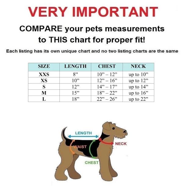 ATTENTION! THERE IS NO STANDARD SIZING SYSTEM FOR PET CLOTHING. Pet clothing is based on MEASUREMENTS and not weight or breed! Before placing an order, please measure your pets' LENGTH, CHEST and compare them to the sizing chart provided in the photos and size options. Each and every different brand/style of pet clothing has its own sizing system. One brand size Medium can very well be another brand size X-Large. Each brand, item, and style has its own unique sizing chart and no two charts are the same.